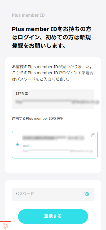 ※他のSTPRのグループですでにSTPR IDでログインされている場合、STEP4はスキップとなりますのでSTEP5へお進みください。 入力したメールアドレスに紐づけるPlus member IDが表示されます。 ※他にPlus member IDをお持ちの場合、ページ下部にPlus member IDをご入力ください